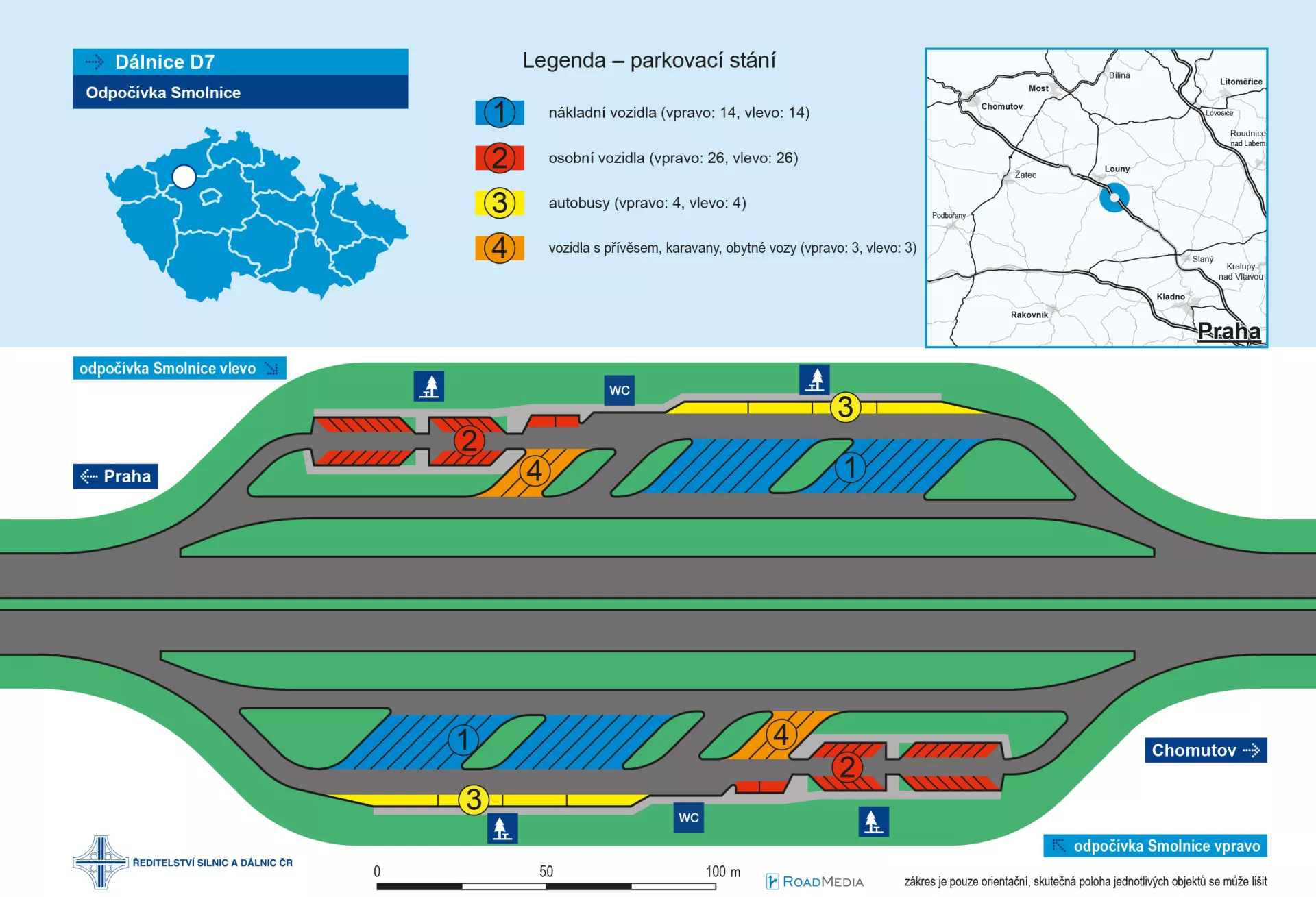 ŘSD zahájilo výběrové řízení na zhotovitele stavby “D7 odpočívka Smolnice km 42 P+L”. K zahájení soutěže na zhotovitele stavby došlo 19. 2. 2025. Jako základní termín pro podání nabídek bylo stanoveno datum 25. 3. 2025. Nelze ovšem vyloučit, že dojde k prodloužení této lhůty. Na oboustrannou odpočívku na již dokončeném úseku zkapacitnění obchvatu Chlumčan je vydáno pravomocné stavební povolení a jsou provedeny hrubé zemní práce, které byly zrealizovány společně se stavbou hlavní trasy D7. Realizací vznikne mj. 28 stání pro nákladní automobily či 54 stání pro osobní automobily. Parkovací plochy budou mít i autobusy a karavany. Předpokládaná cena stavby je 142 555 092 Kč (bez DPH). Zahájení stavby předpokládá ŘSD v letošním roce a dokončení v roce 2026.