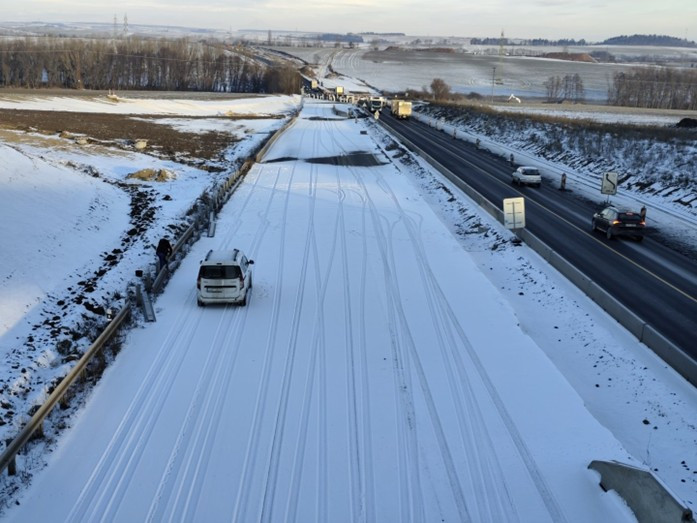Také na začátku nového roku pokračují práce na stavbě úseku D7 mezi MÚK Knovíz a MÚK Slaný-západ. Z hlediska zemních prací jsou dotěženy zářezy a u násypů probíhá konsolidace. V začátku úseku a úseku od ČSPH po most přes silnici III/00725 jsou provedeny konstrukční vrstvy. Na MÚK Kvíc jsou dokončeny zemní práce. Úsekově probíhá výstavba kanalizace. Po zprovoznění levého jízdního pásu budou zahájeny práce na pravém jízdním pásu. U všech mostních objektů je hotová spodní stavba (pilíře, opěry). U mostu přes silnici II/118 bude na konci 01/2026 provedeno osazování nosníků, což si vyžádá krátkodobou úplnou uzávěru II/118 pod mostem (plánováno 29. až 31. 1. 2026). Na mostech přes údolí Šternberského a Červeného potoka probíhá budování (betonáž) nosné konstrukce. Kvůli probíhající výstavbě je v celé délce stavby doprava na původní silnici I/7 částečně omezena a provoz je veden dvěma zúženými jízdními pruhy, přičemž je zajištována pravidelná údržba dopravního značení a provádění zimní údržby.